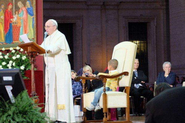 VATIKÁN. Takú veselú omšu a špeciálne ku Dňu rodiny ešte žiadny pápež zrejme necelebroval. A je možné, že málokto by prejavil takú trpezlivosť ako pápež František.